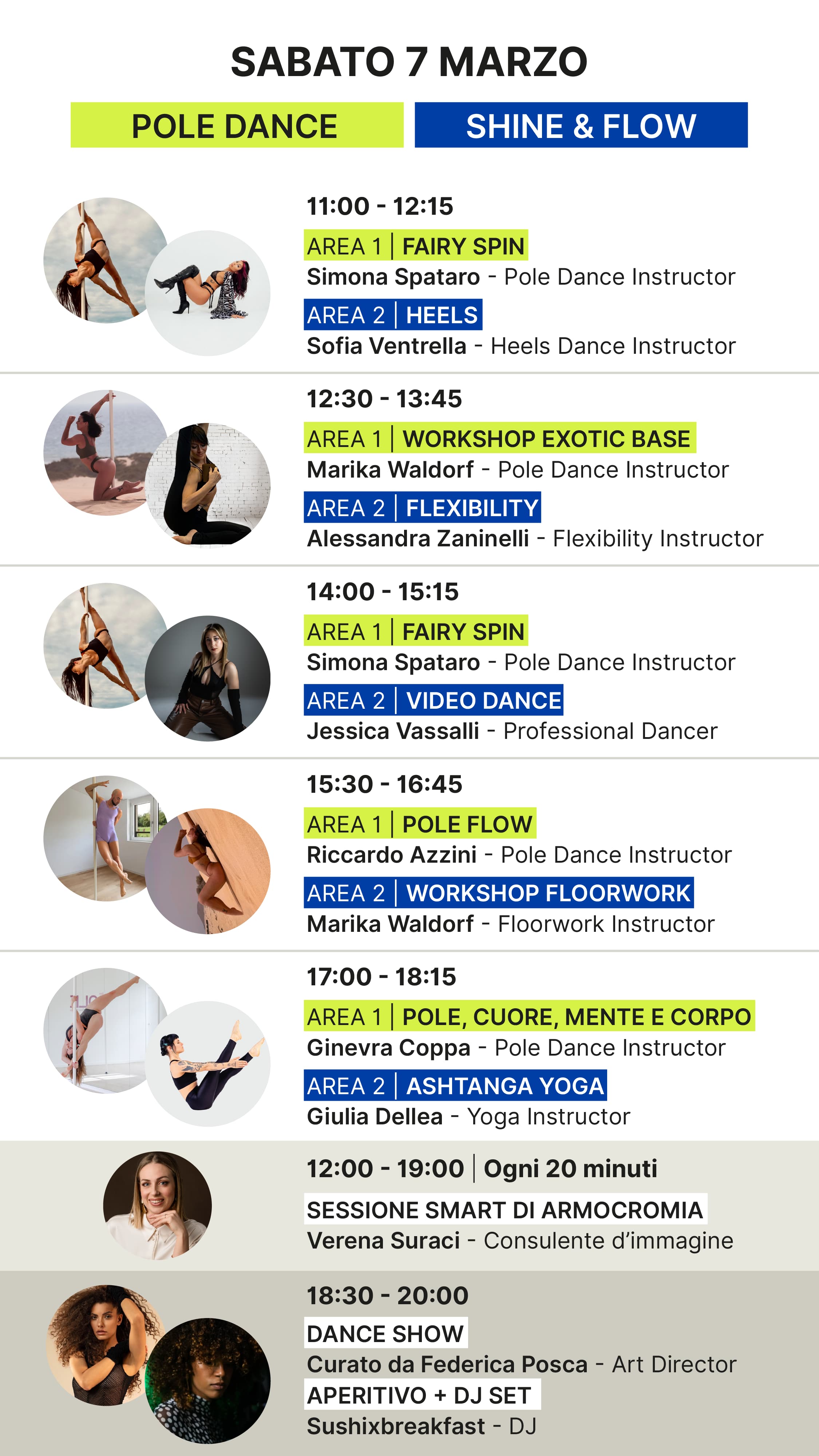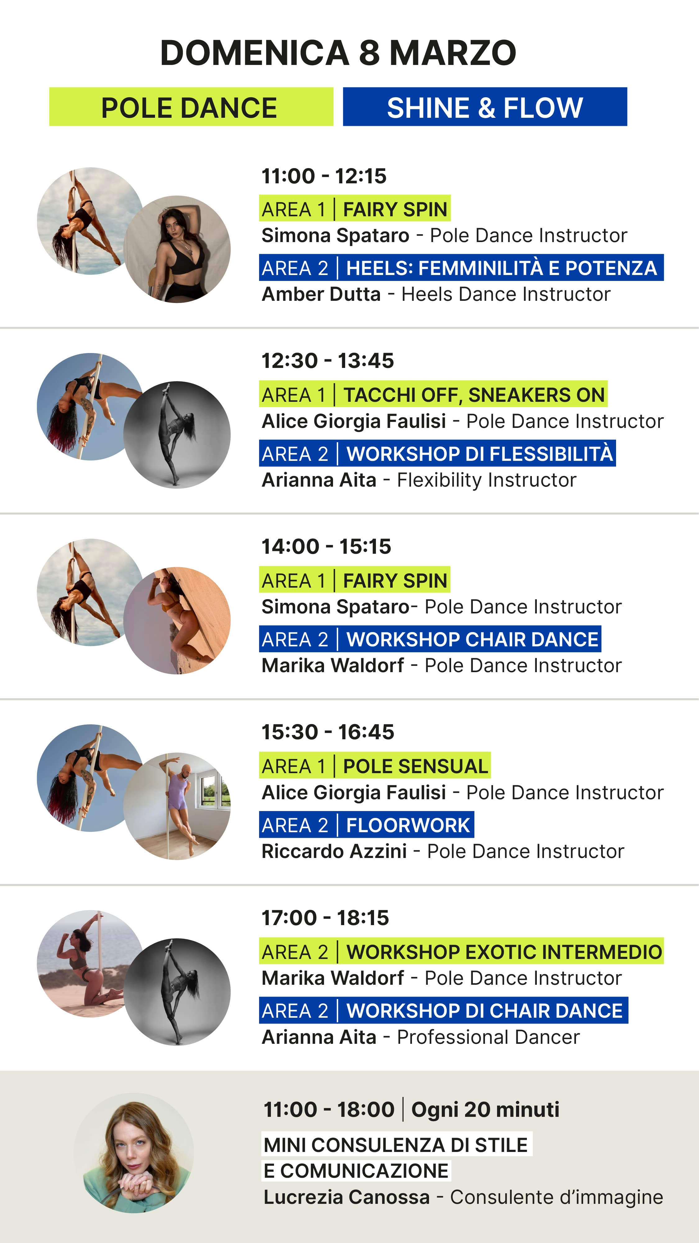 A persona al giorno: max 2 lezioni pole, 1 lezione Shine&Flow e una sessione smart di armocromia e stile
