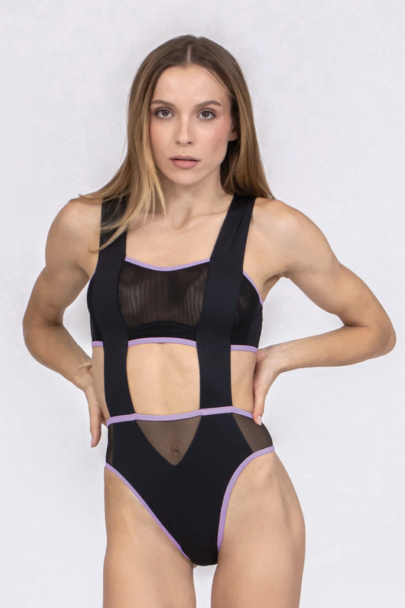 Realizzato in lycra ultra elasticizzata con inserti in rete trasparente, esalta le forme con un design audace e sofisticato. Il gioco di fasce e cut-out scolpisce la silhouette, mentre l’arriccio sul lato B aggiunge un delicato effetto push-up, valorizzando le curve in modo naturale.
