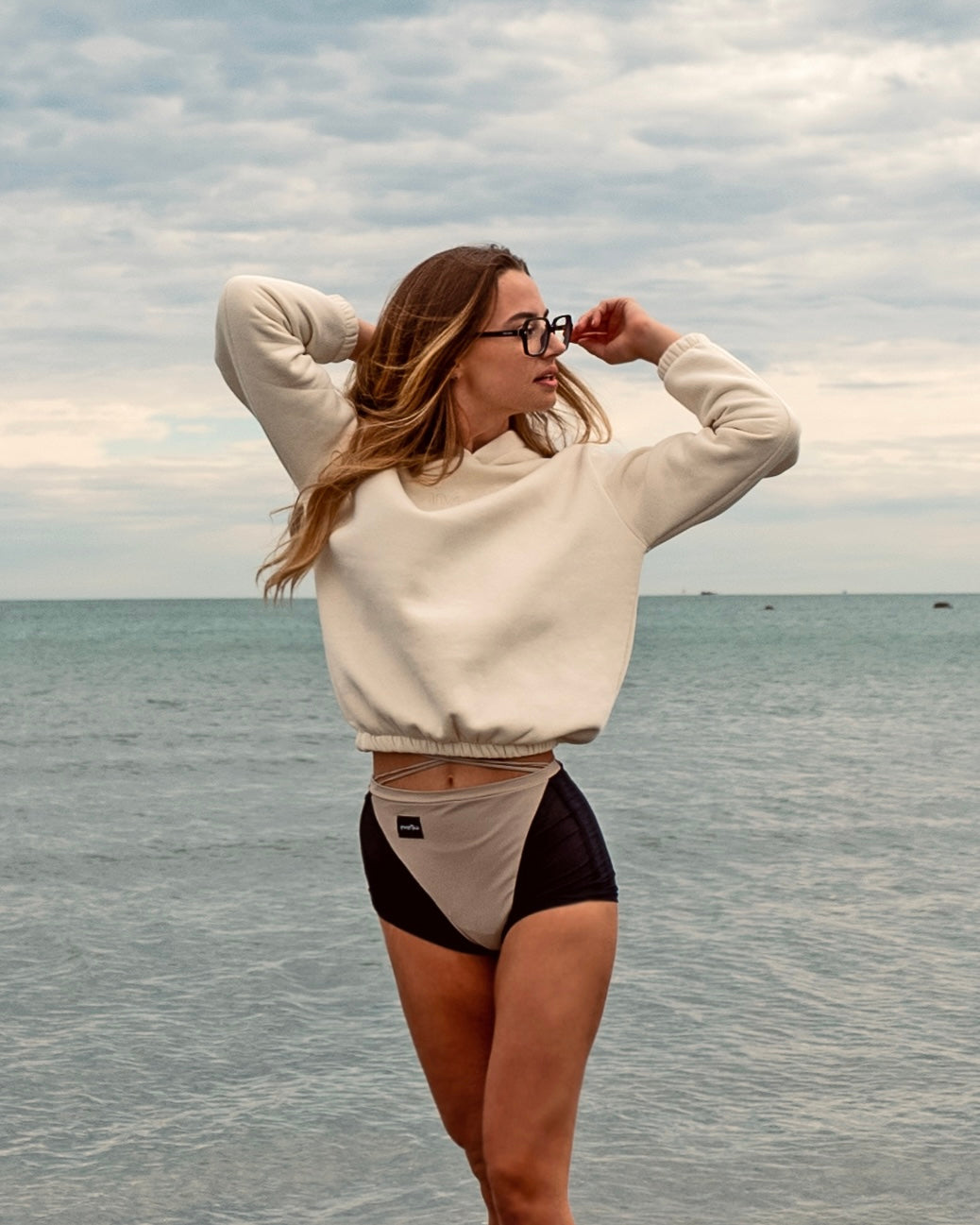 Il Set Unika Sand di Invertika, Made in Italy, è realizzato in lycra nera e retina tono su tono. Il top ha una scollatura a V con retina che valorizza il décolleté, mentre la fascia posteriore aggiunge eleganza.
